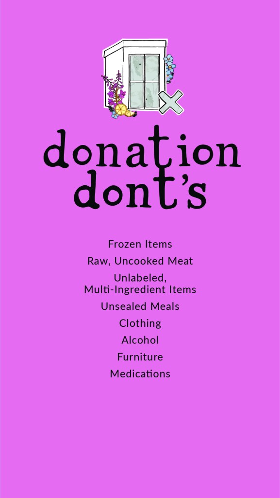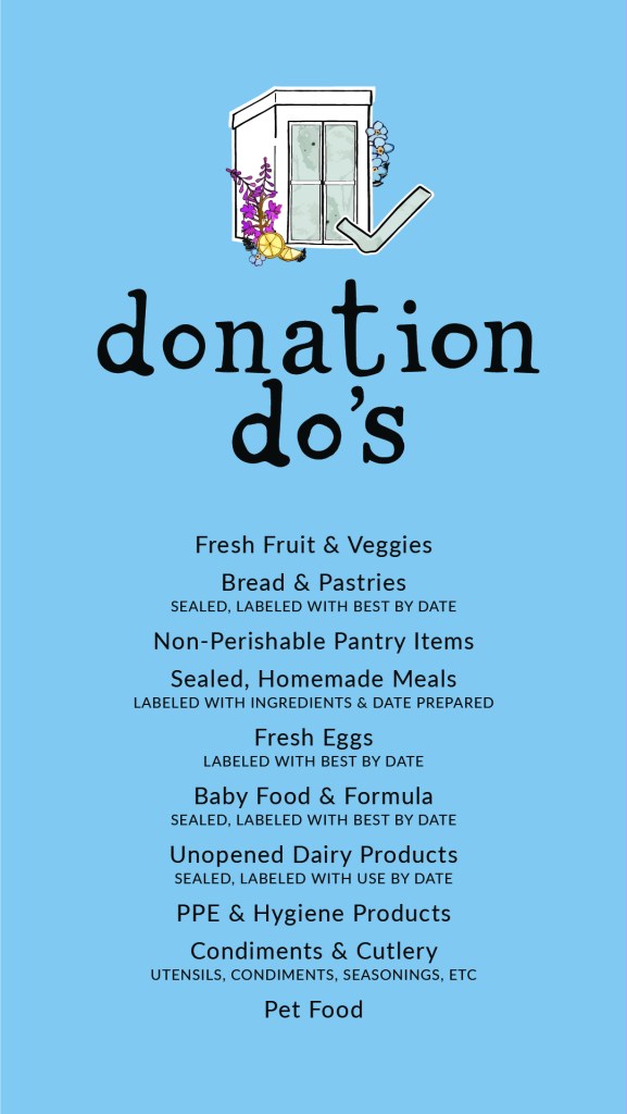 Donate fresh produce, non-perishable items & labeled, dated, packaged meals to one of our community fridge sites